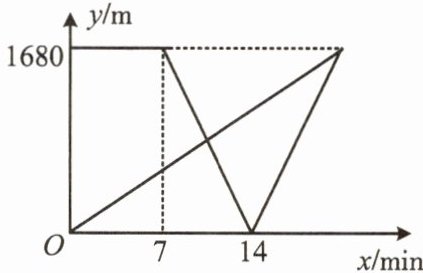 1. 已知A,B两地相距1680 m,甲沿一条笔直的公路从A地出发步行到B地.乙骑自行车比甲晚7 min从B地出发,沿同一条公路到达A地后立刻以原速度返回,并与甲同时到达B地.甲、乙离A地的距离y(m)与甲行走时间x(min)的函数图象如图所示,甲出发后两人第1次相遇所需的时间是(