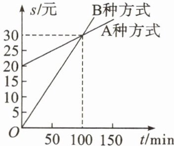 2. 某通信公司推出两种不同的收费方式:A种方式的月租费是20元,B种方式的月租费是0元.一个月内的通话时间t(min)与电话费s(元)的函数关系如图所示.当通话时间为200 min时,这两种方式的电话费相差(