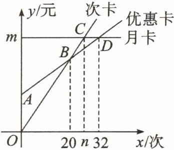 (1)次卡对应的函数关系式为$ y_{1}=1.5x(x\geq 0) $,将$ x=20 $代入$ y_{1}=1.5x $,可得$ y_{1}=30 $,所以点B的坐标为(20,30).设优惠卡对应的函数关系式为$ y_{2}=kx+b(x\geq 0) $,将A(0,15),B(20,30)代入$ y_{2}=kx+b $,得$ b=15 $,$ 20k+b=30 $,$ k=0.75 $,所以优惠卡对应的函数关系式为$ y_{2}=0.75x+15(x\geq 0) $.将D(32,m)代入$ y_{2}=0.75x+15 $,可得$ m=39 $,将C(n,39)代入$ y_{1}=1.5x $,可得$ n=26 $,所以$ m=39 $,$ n=26 $.选择次卡时y与x的函数关系式为$ y=1.5x $;选择优惠卡时y与x的函数关系式为$ y=0.75x+15 $.
