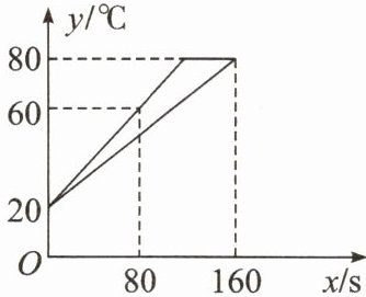 ℃.(2)设乙壶的水温y关于加热时间x的函数关系式为$ y=kx+b(k≠0) $,将(0,20),(160,80)代入$ y=kx+b $,得$ 20=b $,$ 80=160k+b $,解得$ k=\frac{3}{8} $,所以乙壶的水温y关于加热时间x的函数解析式为$ y=\frac{3}{8}x+20 $。