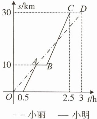 10. 小明和小丽骑车去山庄游玩,小明比小丽晚出发0.5 h,追上小丽后休息了一段时间,继续以相同的速度骑行.他们离出发点的路程s(km)关于时间t(h)的变化情况如图所示.