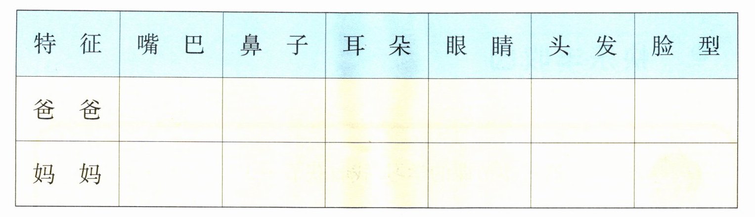 回家看一看,你的五官与其他特征像谁更多一点呢?把你看到的结果填到下页的表中吧。(把你的选择打上“√”。)