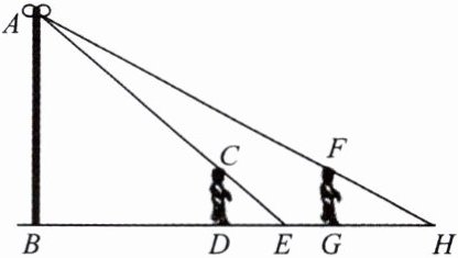 15. 如图,路边有一盏路灯 $ AB $,在路灯灯光下,小明在点 $ D $ 处的影长 $ DE = 3 \, m $. 小明沿 $ BD $ 方向行走到点 $ G $,$ DG = 5 \, m $,这时小明的影长 $ GH = 5 \, m $. 如果小明的身高 $ CD = FG = 1.7 \, m $,求路灯 $ AB $ 的高度(精确到 $ 0.1 \, m $ ).