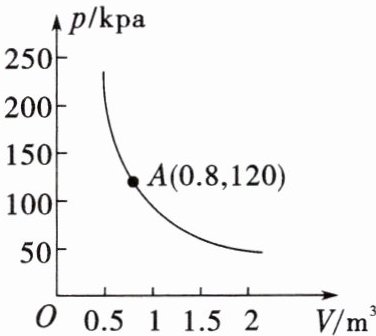(1)设$p=\frac {k}{V},$将点$A(0.8,120)$代入$p=\frac {k}{V},$得$120=\frac {k}{0.8}$,解得$k=96,$