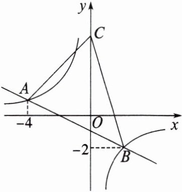14. 如图,一次函数 $ y_1 = kx + b $ 与反比例函数 $ y_2 = -\frac{4}{x} $ 的图象交于点 $ A(-4,m) $,$ B(n,-2) $,点 $ C(0,5) $ 是 $ y $ 轴上一点.