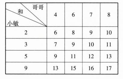 19. 小敏的爸爸买了 1 张某项体育比赛的门票,小敏和哥哥都很想去看比赛,可只有 1 张门票。读九年级的哥哥想了一个办法,拿了 8 张扑克牌,将牌面数字为 2,3,5,9 的 4 张牌给小敏,将牌面数字为 4,6,7,8 的 4 张牌留给自己,并按如下游戏规则进行:他俩从各自的 4 张牌中随机抽出 1 张,然后将抽出的两张牌上的数字相加,若和为偶数,则小敏去;若和为奇数,则哥哥去。