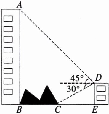 3. 如图,大楼 $ AB $ 右侧有一障碍物,在障碍物的旁边有一幢小楼 $ DE $,在小楼的顶端 $ D $ 处测得障碍物边缘点 $ C $ 的俯角为 $ 30^{\circ} $,测得大楼顶端 $ A $ 的仰角为 $ 45^{\circ} $(点 $ B $,$ C $,$ E $ 在同一水平直线上)。若 $ AB = 80 \, m $,$ DE = 10 \, m $,求障碍物 $ B $,$ C $ 两点间的距离。(结果精确到 $ 0.1 \, m $,参考数据:$ \sqrt{2} \approx 1.414 $,$ \sqrt{3} \approx 1.732 $。)