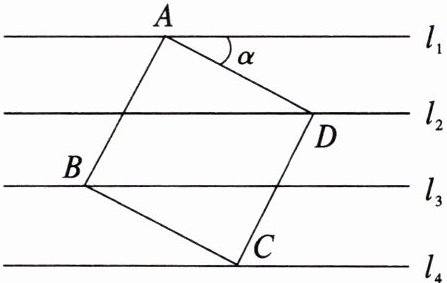16. 如图,已知直线 $ l_{1} // l_{2} // l_{3} // l_{4} $,且相邻两条平行直线间的距离都是 $ 1 $. 如果正方形 $ ABCD $ 的 $ 4 $ 个顶点分别在 $ 4 $ 条直线上,那么 $ \sin \alpha = $
