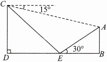 12. 如图,在活动课上,小玥想要利用所学的数学知识测量山坡 $ AE $ 的高度 $ AB $. 她先在山脚下的点 $ E $ 处测得坡顶 $ A $ 的仰角是 $ 30^{\circ} $,然后沿着坡度 $ i = 1:1 $ 的斜坡按 $ 20 m/min $ 的速度步行 $ 15 min $ 到达 $ C $ 处,此时测得点 $ A $ 的俯角是 $ 15^{\circ} $,点 $ A $, $ B $, $ E $, $ D $, $ C $ 在同一平面内,且点 $ D $, $ E $, $ B $ 在同一水平直线上,可求出山坡 $ AE $ 的高度 $ AB $ 是