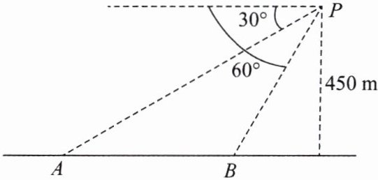 6. 某地地震后,抢险队派一架直升机去$A$,$B$两个村庄抢险,直升机在距地面$450\ m上空的点P处测得A村的俯角为30^{\circ}$,$B村的俯角为60^{\circ}$,如图所示. $A$,$B$两个村庄间的距离是(