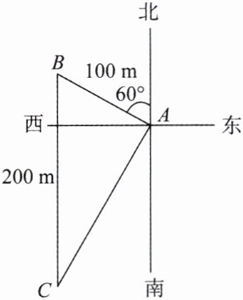 7. 如图,王英同学从$A地沿北偏西60^{\circ}方向走100\ m到B$地,再从$B地向正南方向走200\ m到C$地,此时王英同学离$A$地(