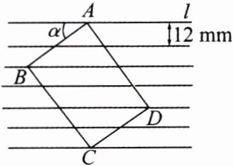 14. 小鹏学完解直角三角形的知识后,给同桌小艳出了一道题:如图,把矩形$ABCD放在每格宽度为12\ mm$的横格纸中,$4$个顶点恰好都在横格线上,已知$\alpha = 36^{\circ}$,则矩形$ABCD$的周长为