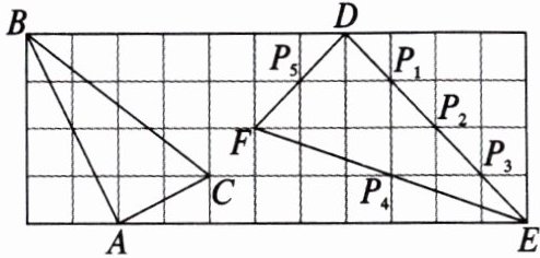 4. 如图,在边长为 1 的小正方形组成的网格中,$\triangle ABC和\triangle DEF$的顶点都在格点上,点$P_{1}$,$P_{2}$,$P_{3}$,$P_{4}$,$P_{5}是\triangle DEF$边上的 5 个格点. 回答下列问题: