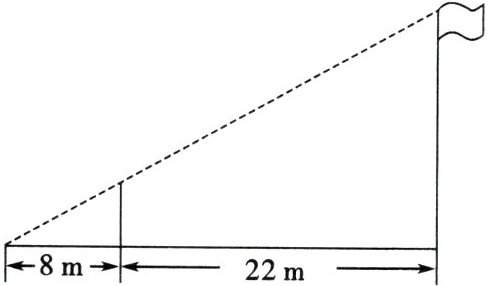 10. 如图,为测量学校旗杆的高度,小东用长为$3.2\mathrm{m}$的竹竿做测量工具.移动竹竿,当竹竿顶端、旗杆顶端的影子恰好落在地面上的同一点处时,竹竿底端与这一点相距$8\mathrm{m}$,与旗杆底端相距$22\mathrm{m}$,则旗杆的高度为