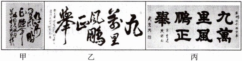 (示例一)甲图中草书最符合诗词意境,字体笔画纵横飘逸、作品气势磅礴,很符合作者在词中所描绘的要像大鹏那样乘万里风高飞远举的神奇意境。(示例二)乙图行书简洁流畅的行笔和线条,在一定程度上率意表情,生动流畅,很符合作者在词中酣畅淋漓地描绘自己要像大鹏那样乘万里风高飞远举的率性情感。(示例三)丙图隶书讲究“蚕头燕尾”“一波三折”,庄重工整。作者在词中所描绘的像大鹏那样乘万里风高飞远举的神奇想象,大气而稳重,符合隶书的特点。(选出其中一幅作品分析即可。)