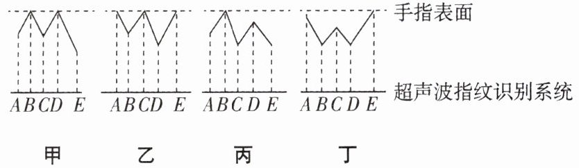 mm.(6)放大手指局部,可以观察到手指表面是凹凸不平的. 超声波指纹识别系统在 A、B、C、D、E 5 个位置发射超声波,遇到手指表面部分超声波会被反射,对应 5 个位置超声波从发射到接收的时间分别为 7.2 $ \mu $s、7.18 $ \mu $s、7.2 $ \mu $s、7.16 $ \mu $s、7.2 $ \mu $s(1 $ \mu $s= $ 10^{-6} $s). 根据时间,可绘出该区域手指表面大致形状可能是图中的