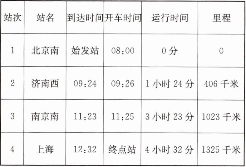 下表是我国北京南站到上海站的某次高速动车组列车运行时刻表.