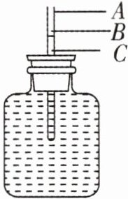10. 为了探究常用温度计的原理,小美取来了一个空水瓶,将其装满染成红色的煤油,用橡皮塞塞紧瓶口,再将吸取饮料用的吸管穿过橡皮塞插入煤油中,制成了一个简单的温度计.她用此温度计记录了早上、中午和傍晚3个时刻吸管中液面的位置.如图所示的A、B、C3处刻线中,中午所对应的刻线是