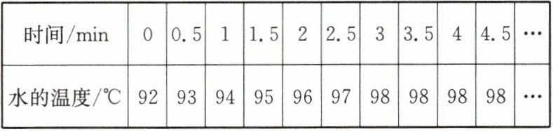 (4)当水温升到$92\ ^{\circ}C$时,每隔$0.5\ min$记录一次温度计的示数,部分数据记录如表。