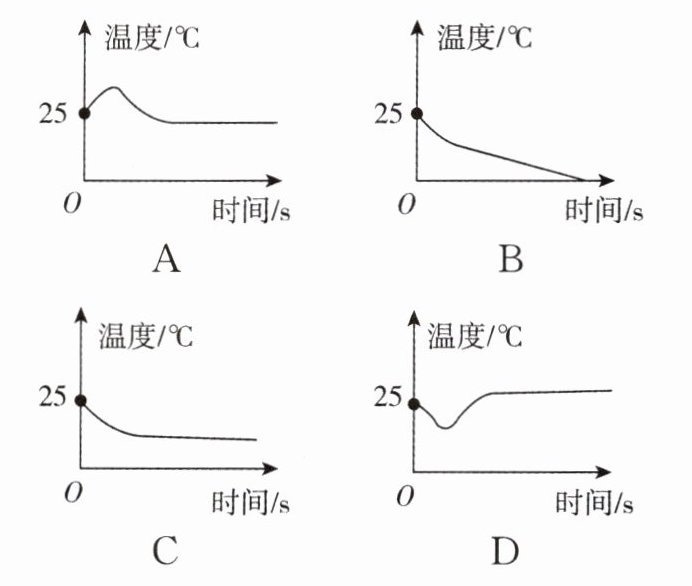 教室内气温为$25\ ^{\circ}C$,小红同学在温度计的玻璃泡上涂有少量与室温相同的酒精。下列图像中,能较正确地反映温度计示数随时间变化的是(