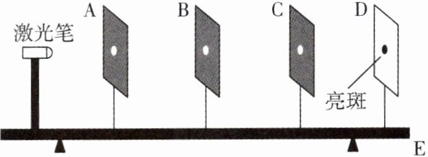 8. 如图所示的“光路演示仪”,A、B、C为相同的中央有小孔的纸板,D是光屏,E为底座. 实验时,打开激光笔,调整纸板A、B、C的位置,光屏D上出现了亮斑,发现此时3块纸板上的小孔在一直线上,可推知光在均匀空气中是沿