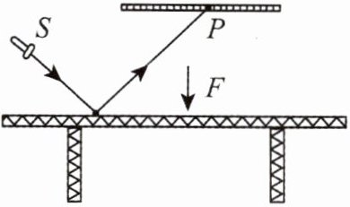 10. 如图为观察微小形变的装置。平面镜放置在水平桌面上,光源 $S$ 发出一束激光射到镜面上,经反射后在标尺上形成光斑 $P$。若在图示位置用力 $F$ 向下挤压桌面,则(