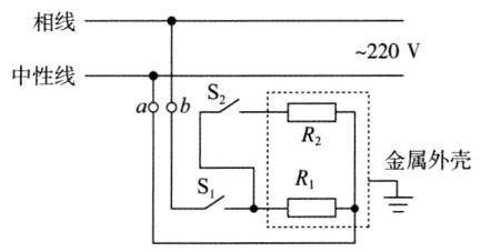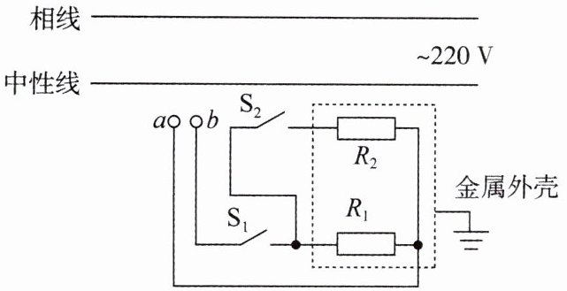25. 某型号煎烤机有上下两个加热盘,由两个开关控制其工作状态. $ R_1 $ 为下盘电热丝,$ R_2 $ 为上盘电热丝,两电热丝阻值相等,煎烤机的最大额定功率为 $ 2200 \, W $. 如图为煎烤机的内部简化电路图(不考虑温度对电热丝阻值的影响)。