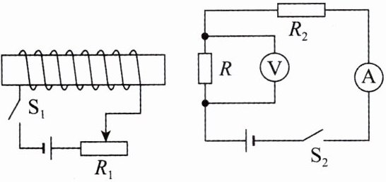 14. 如图所示的电路中,磁敏电阻 $ R $ 的阻值随磁场的增强而明显减小。将螺线管一端靠近磁敏电阻 $ R $,闭合开关 $ S_1 $、$ S_2 $。下列说法正确的是(