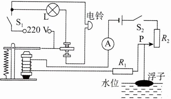 15. 为了应对即将到来的汛期,某课外兴趣小组设计了一个检测水库水位的装置,其原理如图所示。$ L $ 为安全指示灯,电铃为报警器,$ R_1 $ 为定值电阻,$ R_2 $ 为竖直放置、粗细均匀且足够长的电阻棒,滑片 $ P $ 可以在电阻棒上自由滑动,并与浮子用竖直的绝缘杆连接,可随着浮子的上下移动而改变电阻棒 $ R_2 $ 接入电路的阻值,从而可通过电流表的示数来反映水位的高低。当滑片 $ P $ 指向 $ R_2 $ 的中点时,水位达到警戒值,电磁铁吸下衔铁报警。该检测器正常工作时,下列说法正确的是(