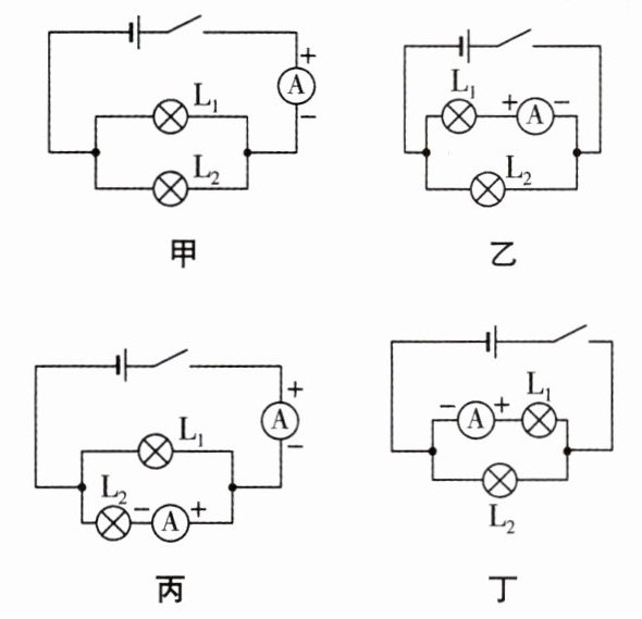 2. 在下列甲、乙、丙、丁$4$个图中,能正确直接测量通过灯$\mathrm{L}_{1}$的电流的电路是(