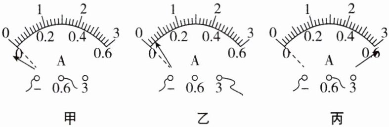 6. 甲、乙、丙$3$位同学在做“用电流表测电流”的分组实验中,闭合开关前,他们的电流表指针均指在零刻度处.当闭合开关试触时,发现电流表指针摆动分别出现了如图甲、乙、丙所示的$3$种情况.请分析他们在电流表的使用上分别存在什么问题,并写在下面的横线上.