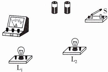 7. 利用如图所示的元件组成并联电路,让电流表测通过灯$\mathrm{L}_{2}$的电流(不超过$0.6\mathrm{A}$),请你帮他回答下列问题.