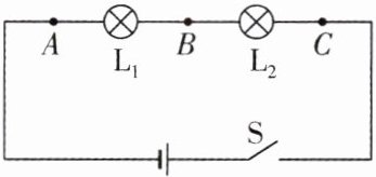 把 2 个小灯泡 $L_{1}$、$L_{2}$串联起来接到如图所示的电路中,分别把图中 $A$、$B$、$C$各点断开,把