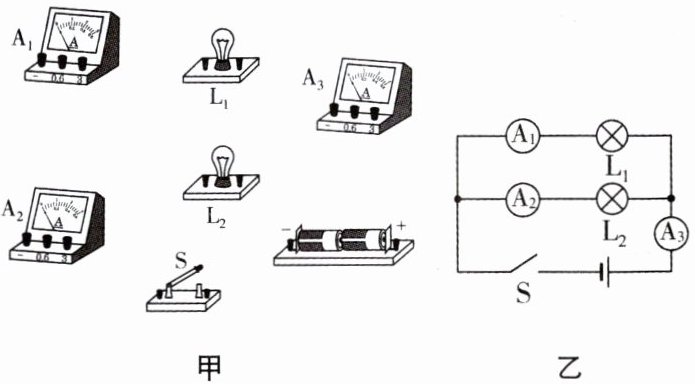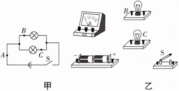 7. 小丽同学进行探究实验的电路如图甲所示,请你用笔画线表示导线,在图乙中连接测量 $A$点电流时的实物电路图. (已知通过两灯泡的电流分别为 0. 3 A 和 0. 4 A. )