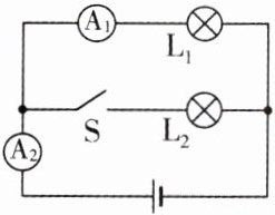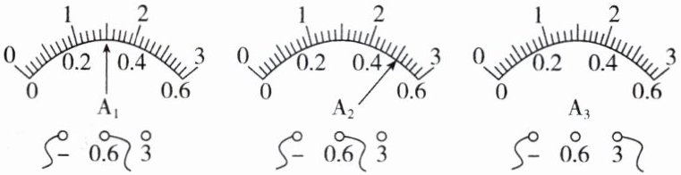 (2)实验时,电流表 $A_{1}$、$A_{2}$的示数分别如图所示,通过灯 $L_{1}$的电流为 A;如不计实验误差,请在图中标出此时电流表 $A_{3}$的指针位置.