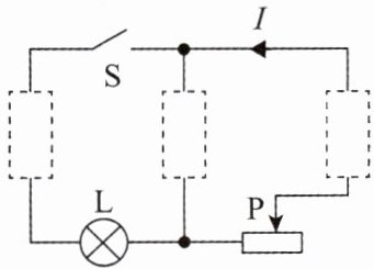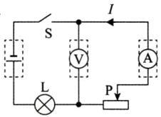 19. 请将电源、电流表、电压表3个元件的符号填入图中电路的虚线框内,并将电路补充完整.要求:开关S闭合后,电流方向如图所示,移动滑动变阻器的滑片P,小灯泡L变亮时,电压表的示数变小.