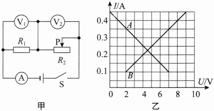 15. 如图甲所示的电路中,电源电压保持不变.闭合开关,将滑动变阻器的滑片P从最右端滑到最左端的过程中,$ R_1 $的I-U关系图像如图乙中某条图线所示.下列判断错误的是(