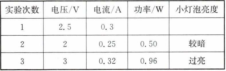 |实验次数|电压/V|电流/A|功率/W|小灯泡亮度|