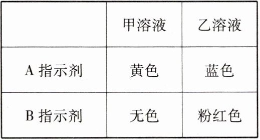 9. 有 $ A $、$ B $ 两种酸碱指示剂,它们的变色情况与溶液 $ pH $ 的关系如图所示,它们在甲溶液和乙溶液中显示的颜色如表所示。下列判断错误的是(