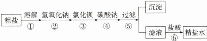 3. 为除去粗盐中含有的氯化镁、硫酸钠、氯化钙等杂质,应加入过量的氢氧化钠、氯化钡、碳酸钠等物质,将杂质转化为沉淀。过滤去除沉淀后,再向滤液中加入适量的盐酸得到精盐水。实验操作过程如下图所示:
