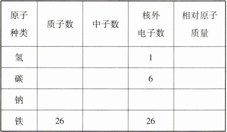 5. 已知质子和中子的质量都约等于 1 个氢原子的质量,每个电子的质量约为每个质子(或中子)质量的 $1/1836$。填写下表并回答问题。