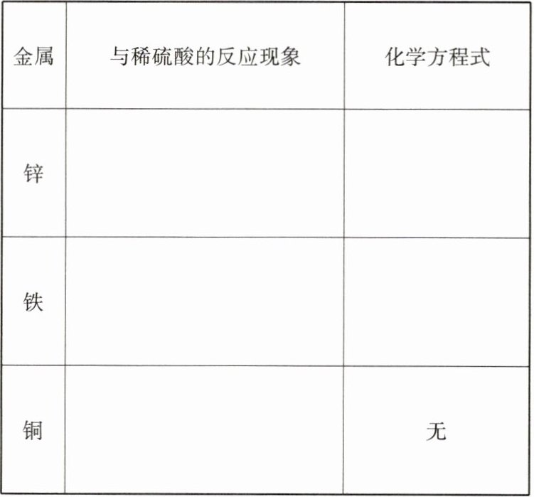 锌片表面有无色气泡,得到无色溶液 Zn+H₂SO₄=ZnSO₄+H₂↑ 铁片表面有无色气泡,溶液由无色变成浅绿色 Fe+H₂SO₄=FeSO₄+H₂↑ 无现象 Mg、Al、Zn、Fe Cu、Hg、Ag 氢前面的金属 稀盐酸、稀硫酸