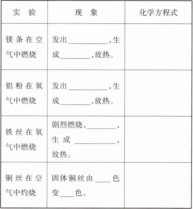 耀眼白光 白色固体 2Mg+O₂$\stackrel{点燃}{=}$2MgO 耀眼白光 灰白色固体 4Al+3O₂$\stackrel{点燃}{=}$2Al₂O₃ 火星四射 黑色固体 3Fe+2O₂$\stackrel{点燃}{=}$Fe₃O₄ 红 黑 2Cu+O₂$\stackrel{△}{=}$2CuO 金属本身的性质 氧气的浓度 金属与氧气的接触面积