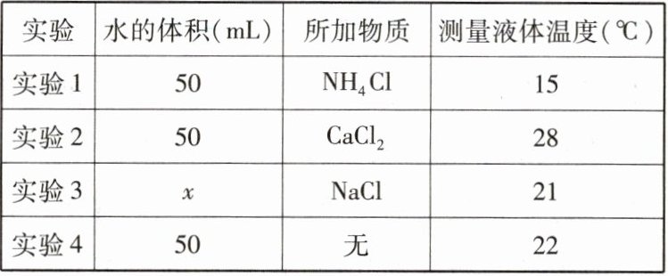 |实验|水的体积(mL)|所加物质|测量液体温度(℃)|