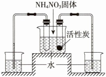 7. 用如图所示装置探究“活性炭吸附能力与温度变化的关系”。将硝酸铵$(NH_4NO_3)$固体加入到水中搅拌,观察到两侧玻璃导管中液面上升的高度不同(如图所示)。