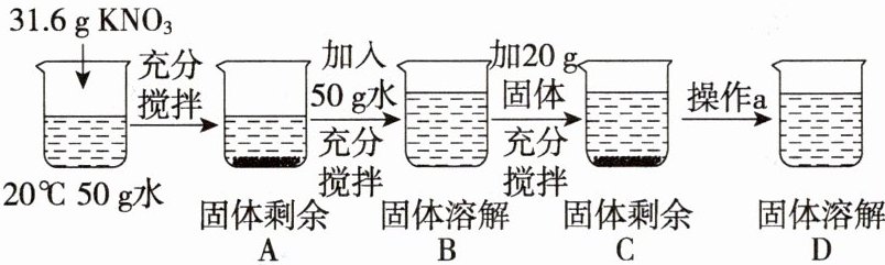 5. 20℃时,向 50 g 水中加入$ 31.6 g KNO_3$固体并进行如下系列操作。请回答相关问题: