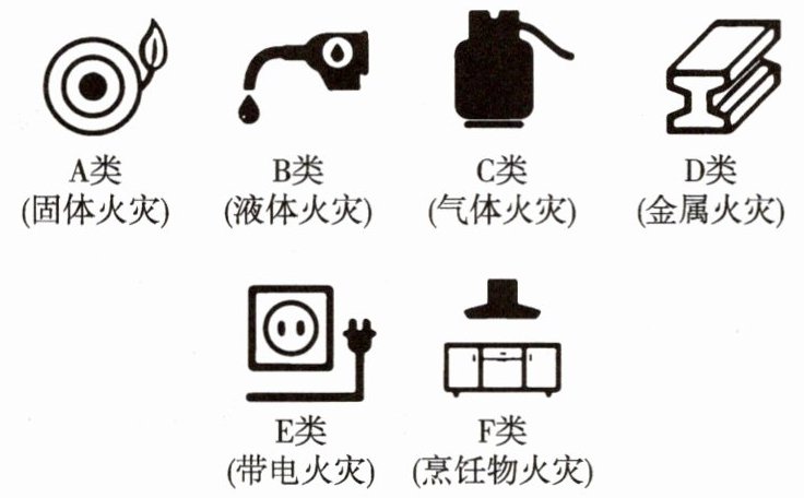 根据可燃物的类型和燃烧特性,火灾分为 A、B、C、D、E、F 六大类(如图)。不同类型的火灾,燃烧物和燃烧特性不同,采取的灭火方法也不同。