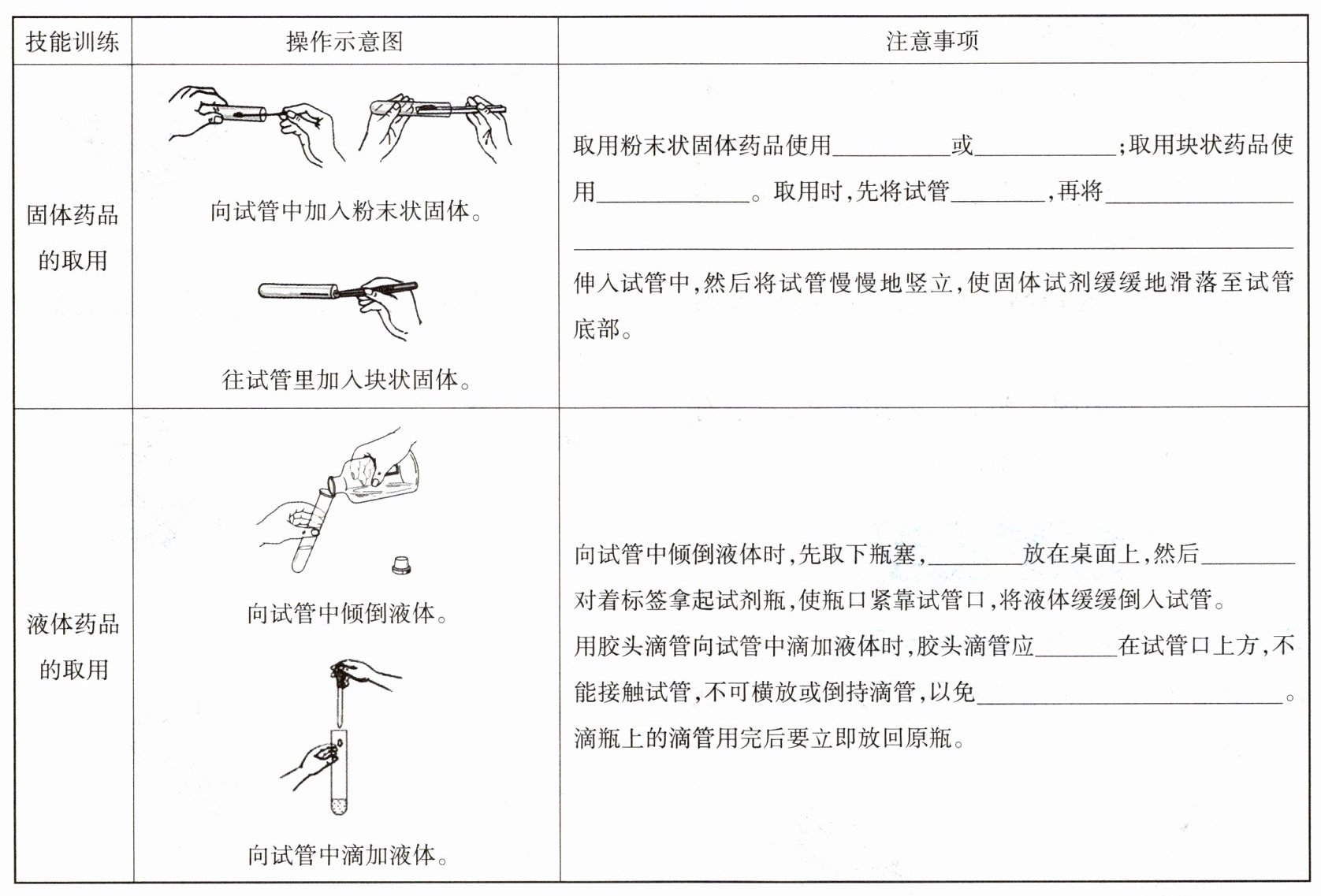 药匙 纸槽 镊子 平放 盛有粉末状固体的药匙或夹持块状固体的镊子 倒 手心 垂悬 药品腐蚀胶帽