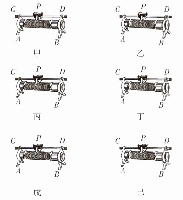 甲、乙、丙、丁四种接法可以实现变阻。当滑片向右移动时,电阻的变化情况分别是:甲,变大;乙,变大;丙,变小;丁,变小;戊,不变;己,不变。