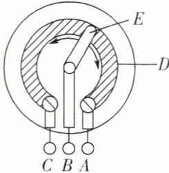 例 2 如图是一种可以改变收音机音量大小的电路元件结构示意图,A、B、C 是固定的铜片,D 是一段弧形电阻,E 是一端连接在 B 上、另一端可在 D 上滑动的铜片。为了使滑片 E 顺时针转动时音量增大(通过该元件的电流增大),应该将元件的铜片 B 和铜片